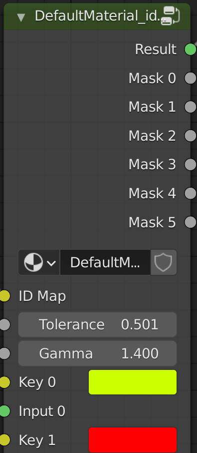 | RGB Key | Color keyer node. Create a mask of the ID Map input using the Key color. |