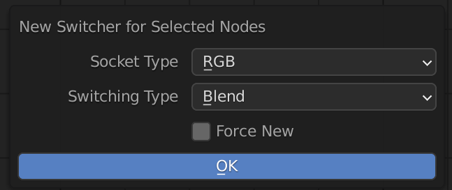 - Switcher node creation is available under the add nodes menu (Shift + A).