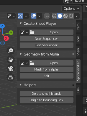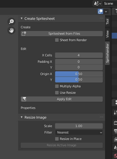 For convenience, the addon also includes an image resizing function. Unlike the normal Blender image resize option, the Spritehandler resizer offers a selection of filters. Use the Nearest filter when working on pixel art.# Spritesheet Usage There are two general methods for Spritehandler to make use of spritesheets. Spritesheets (and Atlases) are expected to be uniform, thought the meshing tool will work on any image with an alpha.